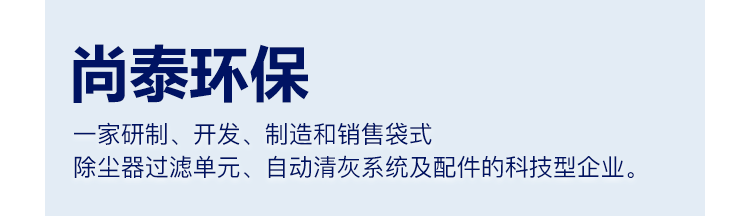 上海尚泰環(huán)保配件有限公司創(chuàng)立于2006年5月,是一家研制、開發(fā)、制造和銷售袋式除塵器過濾單元、自動清灰系統(tǒng)及配件的科技型企業(yè)。